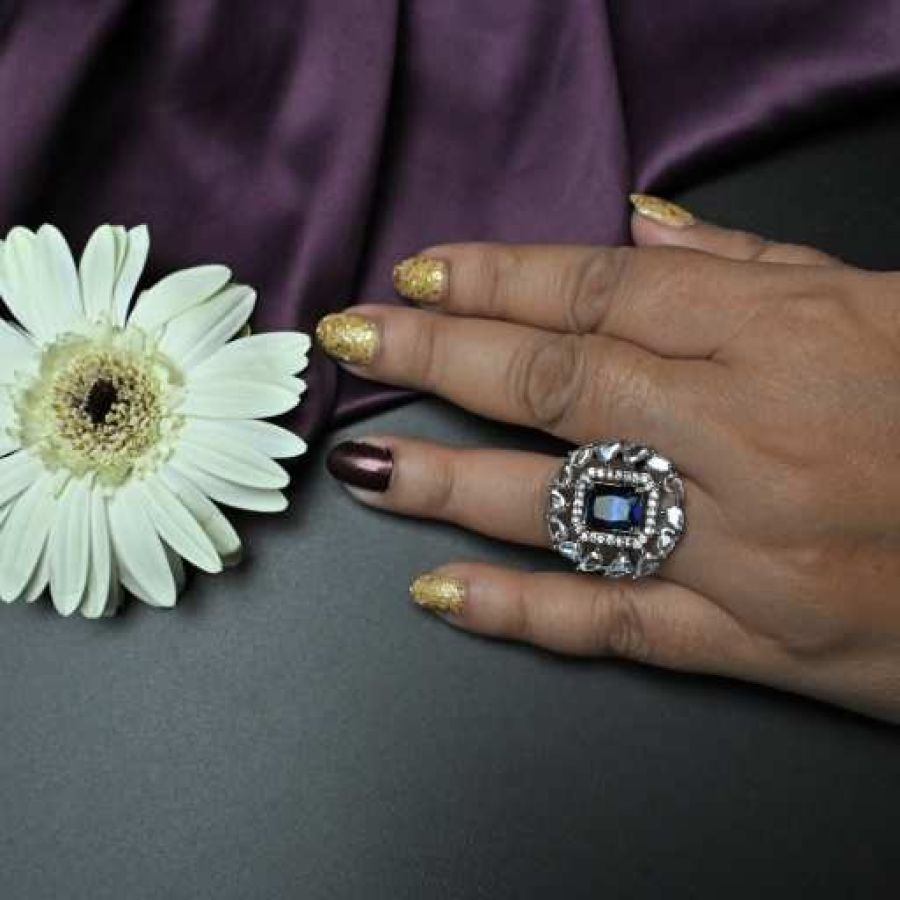A stylish still life display featuring a hand with nails polished in gold and dark brown, wearing a large silver ring set with a blue gemstone. A white daisy is placed beside the hand, arranged against a background of purple satin fabric and a gray surface.
