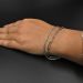 A minimalist close-up of a wrist wearing two silver bracelets against a dark background. One bracelet features a braided chain design, while the other consists of rectangular links, creating a simple and elegant accessory combination.