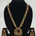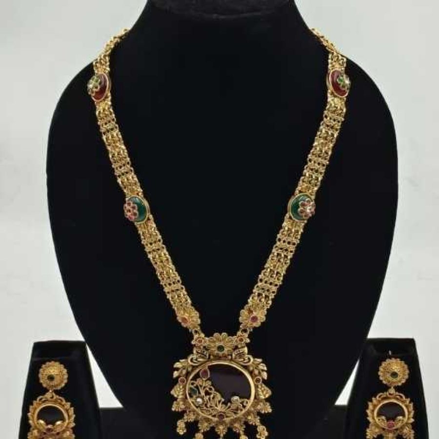 Elaborate gold necklace with emerald and ruby accents, detailed pendant, and dangling earrings. Perfect for bridal or festive ethnic wear.Untitled-design-7.jpg