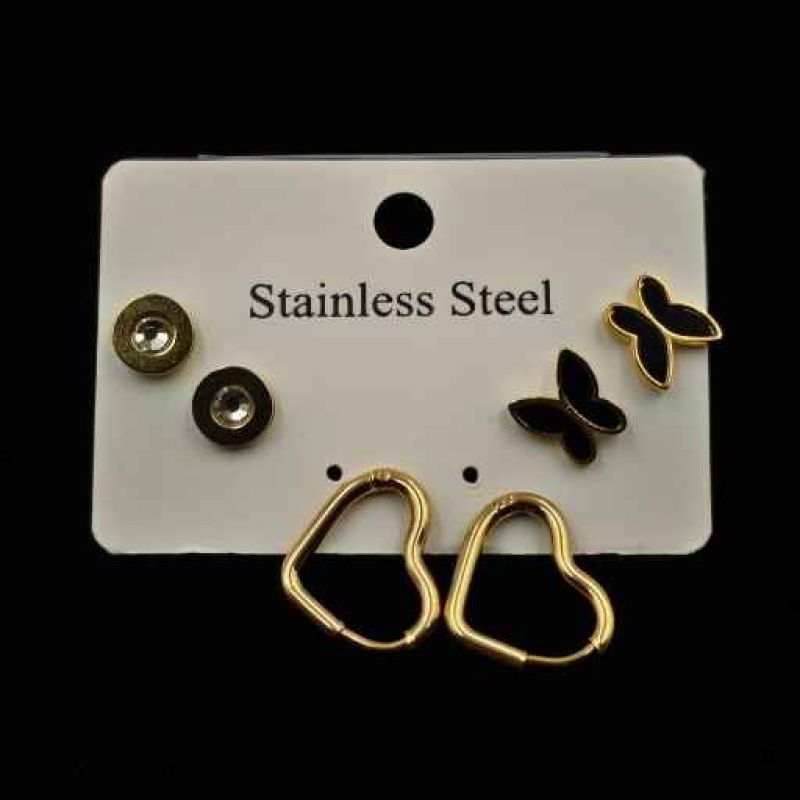 A variety of stainless steel stud earrings displayed on a white card labeled "Stainless Steel" against a black background. The collection includes designs such as round studs with rhinestones, butterfly shapes, and heart-shaped earrings with gold borders.