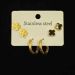 A collection of gold earrings displayed on a white card labeled "Stainless steel" against a black background. The set features gold four-leaf clover studs in varying sizes, clover studs with black hearts and gold borders, and a pair of gold hoop earrings.