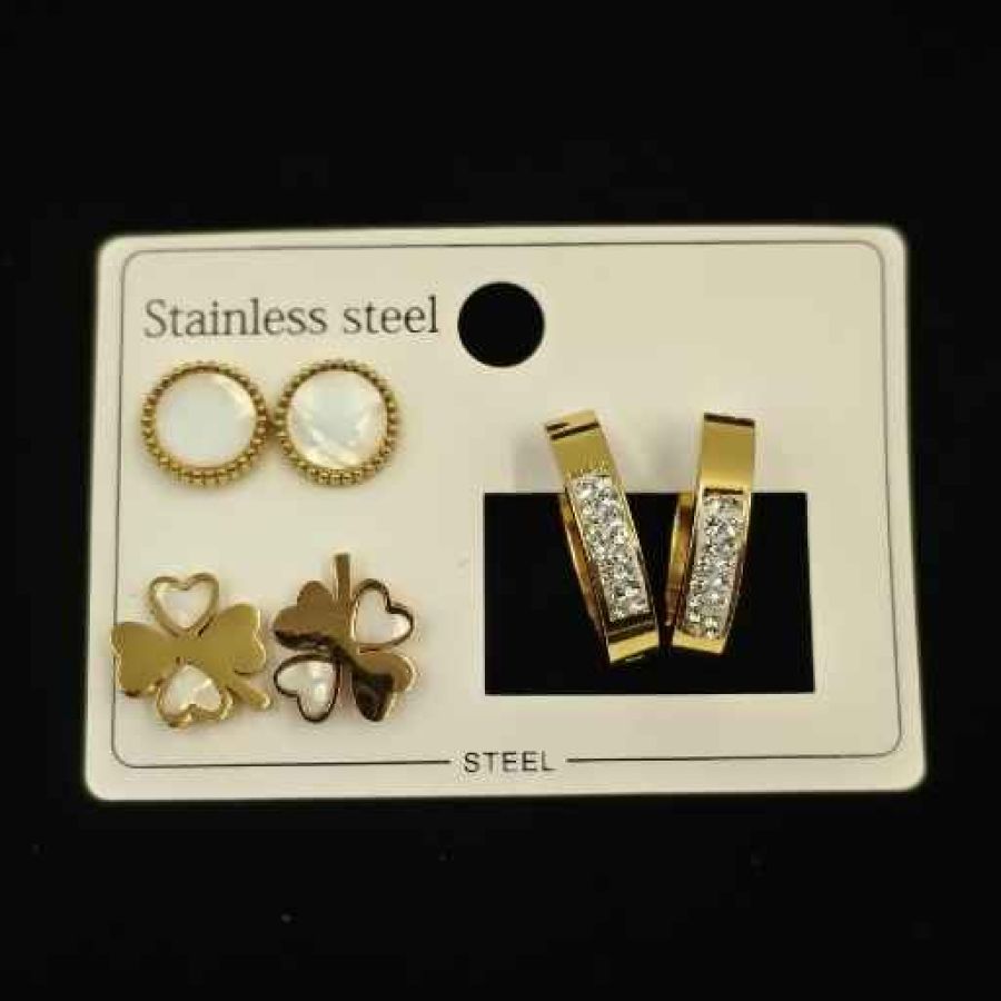 A collection of stainless steel jewelry displayed on a white card labeled "Stainless steel" and "STEEL" against a black background. The set features round earrings with pearls, four-leaf clover designs in gold and brown-gold tones with white accents, and gold clip-on earrings adorned with rhinestones.