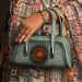 This sophisticated teal gray textured structured handbag showcases gold-tone handles and clasps, centered by an eye-catching orange-brown circular embossed medallion.