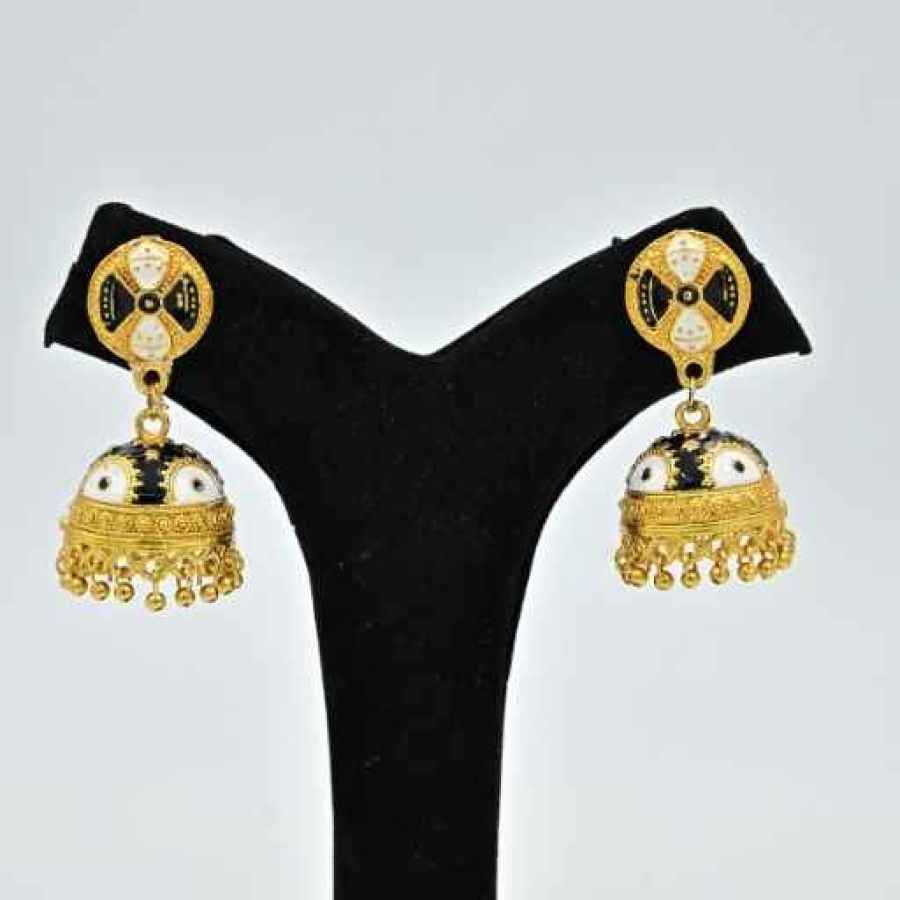 This pair of earrings showcases a luxurious and ornate traditional style, crafted in gold. The design features a circular top element adorned with intricate black, gold, and white patterns, which connects via chains to a prominent bell-shaped pendant.