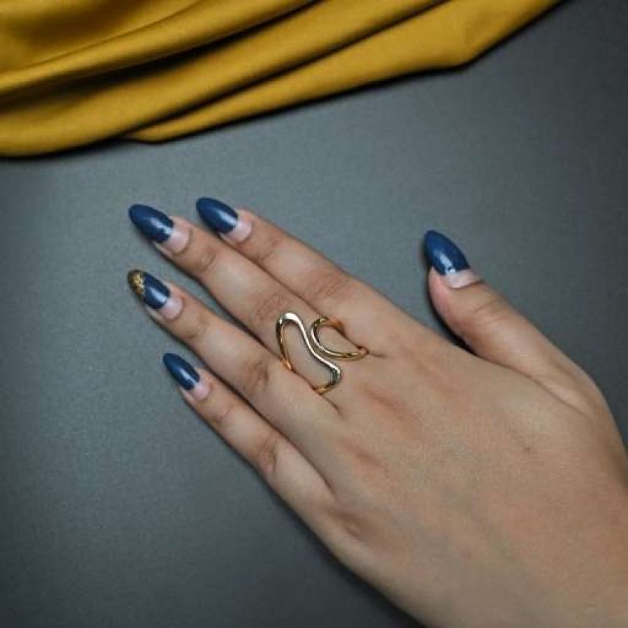 The hand rests on a grey surface with yellow fabric in the background, showcasing a stylish combination of nail art and jewelry.