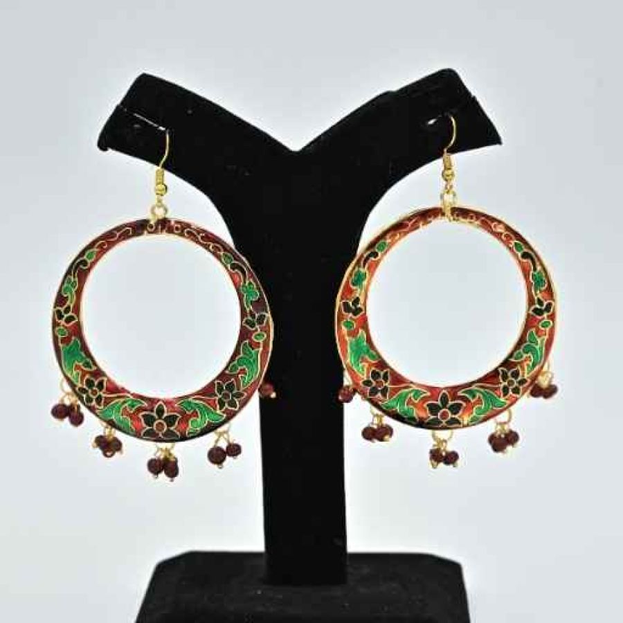 This pair of earrings features a circular design richly adorned with red and green hues, outlined by sophisticated gold borders. The main body showcases intricate floral patterns, evoking a sense of classic elegance.