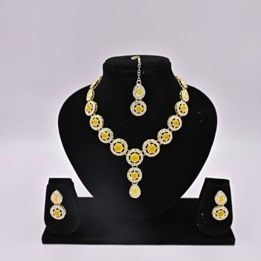 Elegant gold necklace with round yellow stones, drop pendant, maang tikka headpiece, and stud earrings. Great for ethnic celebrations or parties.Untitled-design-7.jpg